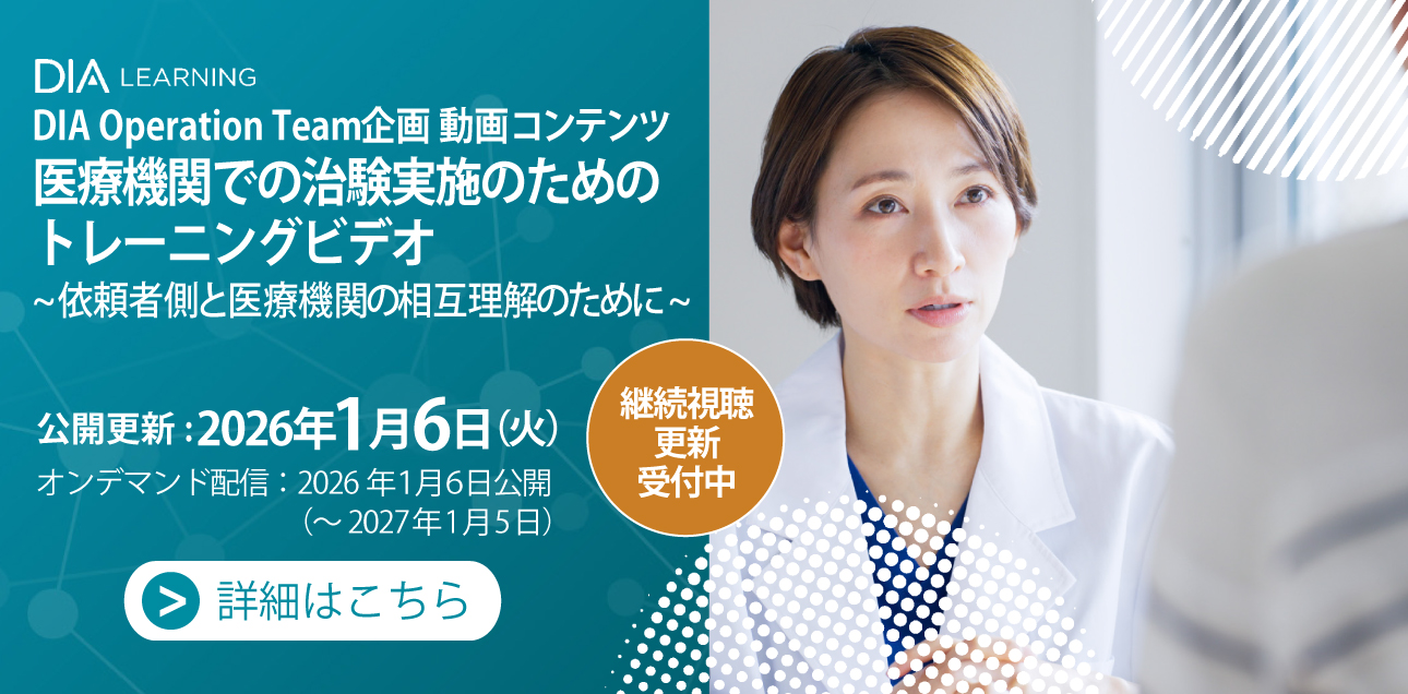 - 2025年1月6日(月)から動画視聴継続をご希望の場合は、更新手続きが必要となります。料金が改訂になっておりますのでご覧の上お申込みください。「DIA LEARNING DIA Operation Team企画 動画コンテンツ 医療機関での治験実施のためのトレーニングビデオ ~依頼者側と医療機関の相互理解のために~」のフライヤーを公開いたしました。こちらからご覧ください。