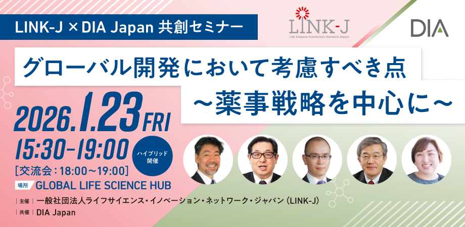 - DIA JapanとLink-J 初の共創セミナー「グローバル開発において考慮すべき点~薬事戦略を中心に~」を2026年1月23日(金)ハイブリッド開催いたします。(会場:GLOBAL LIFESCIENCE HUB およびオンライン)